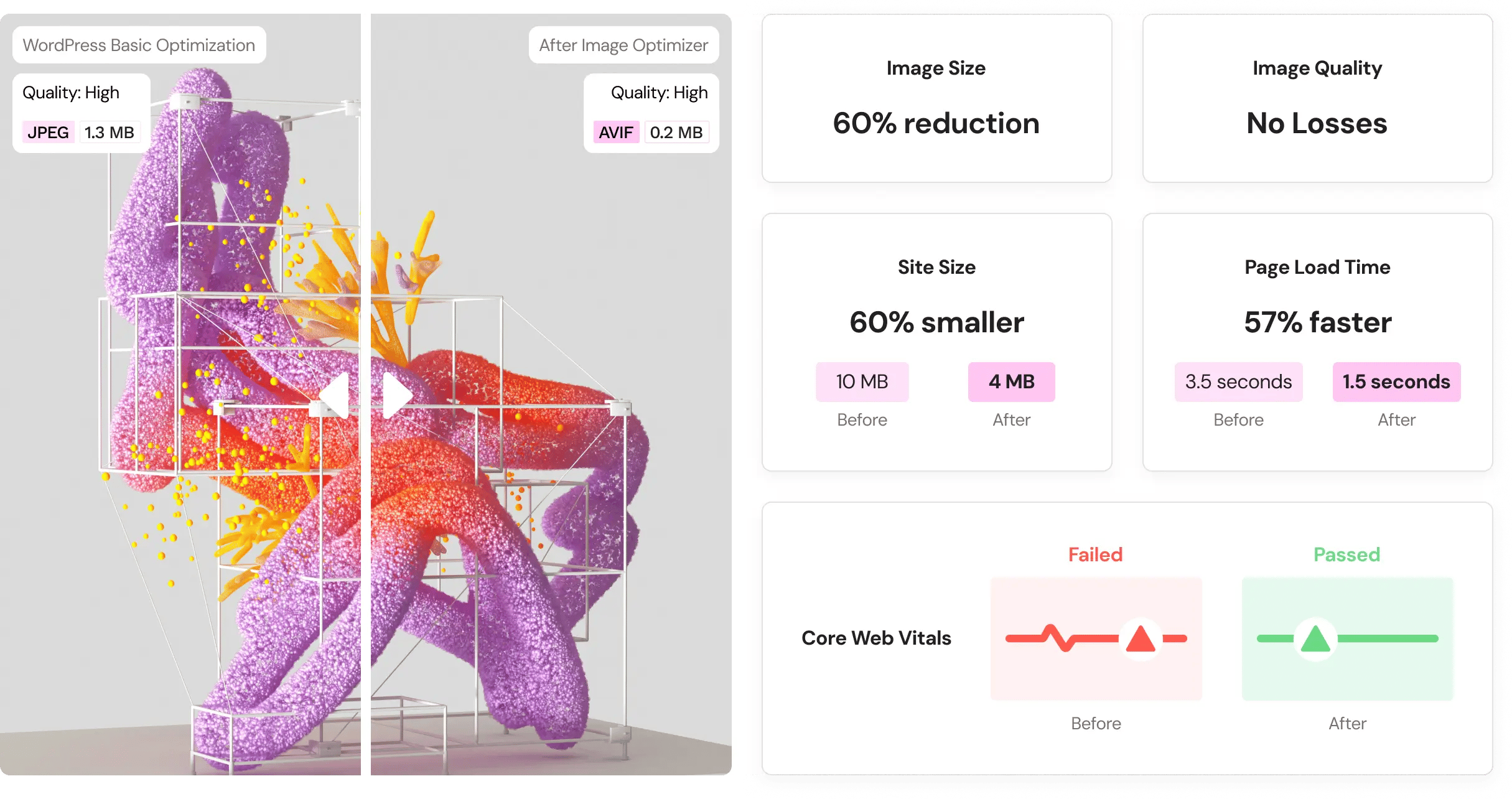 Image optimization can significantly improve your website’s loading time, which is crucial for user experience and SEO. It reduces the size of your images without compromising their quality, leading to faster page load times and better performance scores.