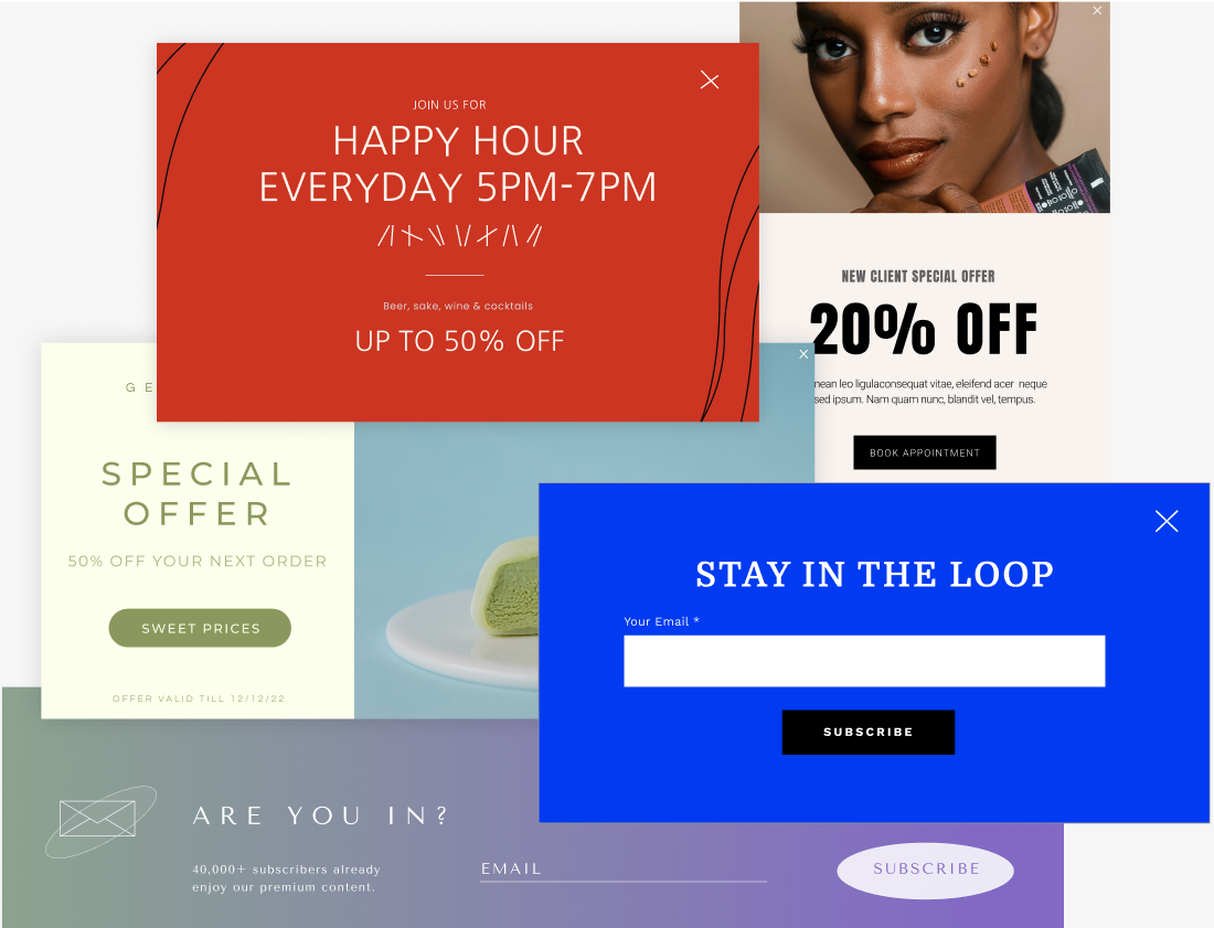 You can create any popup you can imagine, like: email subscriber popups, login forms popups, content lock & upgrades, welcome mat, promotion & sale popups, announcement popups, related products & upsells, exit intent popups, consent forms, countdown timer popups, marketing and sales funnels, and many more!